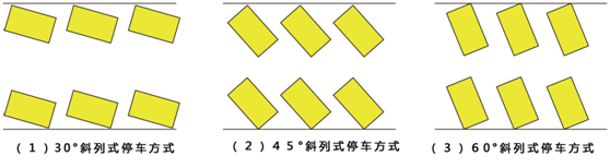 斜放式斜放式停車車身方向與通道成角度停放,一般有30°、45°、60°三種角度,如下圖所示。