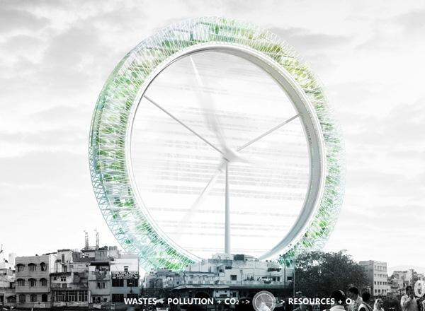 循環(huán)中心是一個(gè)大型的風(fēng)力渦輪,像一個(gè)大肺一樣,轉(zhuǎn)動(dòng)在新德里城市中心,能量及二氧化碳通過(guò)摩天輪里的植物、化學(xué)過(guò)濾器、微小顆粒的膜結(jié)構(gòu)、高空溫室和礦化設(shè)備將氧氣釋放到城市上空。