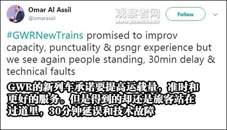 這讓旅客抱怨道:GWR的新列車承諾要提高運(yùn)載量,準(zhǔn)時(shí)和更好的服務(wù)。但是得到的卻還是旅客站在過道里,30分鐘延誤和技術(shù)故障。