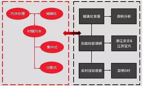 城鎮化下污水處理集中式和分散式問題的集中點聚合在村鎮污水處理領域。本著充分了解現有處理經驗和實地現狀的目的,首先結合城鎮化發展背景和現有集中式污水廠資料,進行集中式污水處理技術的統計分析;其次,了解在國內外分散式污水處理模式的同時,重點參觀學習國內規劃設計較為成熟的村鎮(浙江安吉、江蘇宜興等地);最后,為更好的了解農村污水處理的現狀,在我們熟悉的上海崇明深入農村當地,進行實地走訪、實驗調查,充分了解當地城鎮化污水處理規劃中的問題。