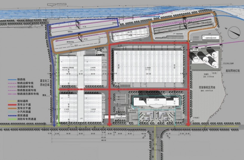 嘉寶物流園區是依托鐵路運輸為主的綜合服務型陸港物流園區,園區規劃在總體策略上應該緊緊圍繞鐵路運輸作業及運輸貨物品類研究物流作業的空間布局,依托各條鐵路專用線不同的物流服務內容,服務對象及服務方式進行物流資源與設施的整合與優化。將運輸、倉儲、裝卸搬運、管理等物流功能分區緊密聯系,使各功能分區之間既能獨立承擔物流服務業務,又能共同承擔更綜合的服務。