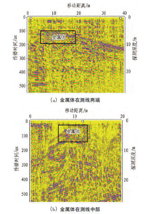 在進行底板探測時,測線附近通常放置有金屬體( 如臺車、裝載機、電機等) ,會對探測結果產生干擾。當金屬體位于測線兩端時,其在雷達圖像上反映為雙曲線的一翼,如圖7( a) 所示; 當金屬體位于測線中間時,其在雷達圖像上反映為雙曲線,如圖7 ( b) 所示。由于雙曲線通常為溶洞在雷達圖像上的反射特征,為防止將金屬體誤判為溶洞等異常體,探測前需撤走測線附近的金屬體。