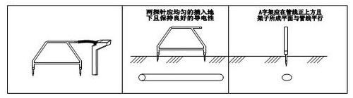 5、管線的對(duì)地泄漏電流可由“A”字架兩腳分別接收,而接收機(jī)顯示的信號(hào)大小則是兩針接收信號(hào)的差值,當(dāng)兩針接收的差值為零時(shí),則說(shuō)明“A”字架在故障點(diǎn)的正上方