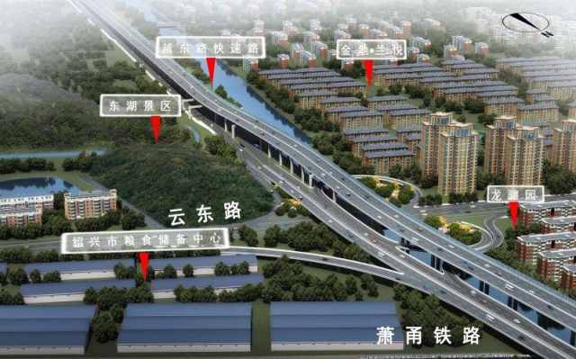 :快速路主線西起湖安路,以地面形式過鏡水路,再以地道形式下穿杭甬高鐵紹興北站區段,接著以地面道路形式向東經綠云路、解放大道之后起坡,保留綠云路和解放大道立交。主線過解放大道之后,起坡以高架形式跨越湯公路、中興大道、越東路等,越東至孫曹公路交叉口段還在研究中。