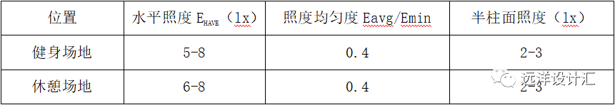 (3)健身場地照明要有足夠的水平照度和垂直照度,同時要有足夠的均勻度。休閑場地照明應(yīng)滿足交流、觀賞和安全需求。見表3-2。