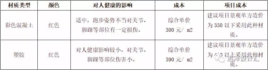根據(jù)鋪裝材質(zhì)、顏色對人健康的影響,綜合項(xiàng)目成本控制,居住區(qū)慢跑步道鋪裝材質(zhì)選擇見下表3-1: