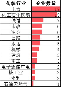 共涉及 14 個(gè)細(xì)分行業(yè):電力、電子通信廣電、公路、核工業(yè)、化工石化醫(yī)藥、機(jī)械、建筑、軍工、石油天然氣、市政、水利、水運(yùn)、鐵道、冶金。其中,電力行業(yè)企業(yè)最多,有 17 家;其次為石油化工醫(yī)藥行業(yè),有 15 家企業(yè),鐵道行業(yè)居第三,有 7 家企業(yè)。