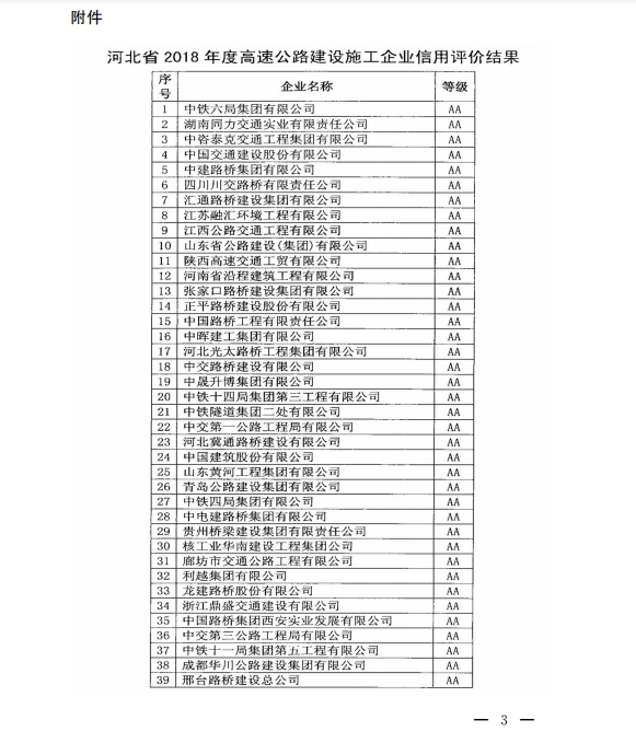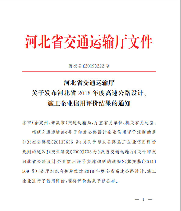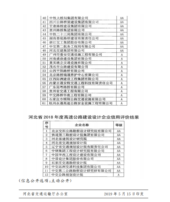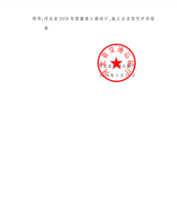 河北省交通運輸廳關(guān)于發(fā)布河北省2018年度高速公路設(shè)計、施工企業(yè)信用評價結(jié)果的通知