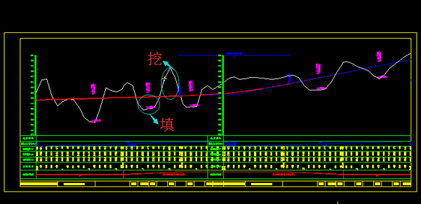 白線是路線中線的高程起伏情況,那么我們一定是想填土和挖土都少一點吧?于是我們考慮縱斷面的填挖平衡且盡量就近平衡??磮D中填挖基本平衡,就近也基本平衡。這里紅線就是我們定下的路線高度位置。圖下面是各種高度數據,填挖土高度數據。平面和縱面要協調設計,有時候發現縱斷面圖形太奇葩,那么平面設計要調整。平縱組合也有原則。后面的橫斷面設計也是會發現前面工作要改的。