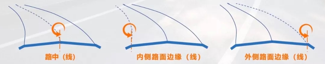 另外一個就是軸線,為了保證超高過渡的平穩(wěn)連續(xù),需要在路面的三個軸線,也就是路中線、內(nèi)存路面邊緣線或外側路面邊緣線將路面進行旋轉(zhuǎn)。從而達到雙向橫坡果斷到單向橫坡的目的。