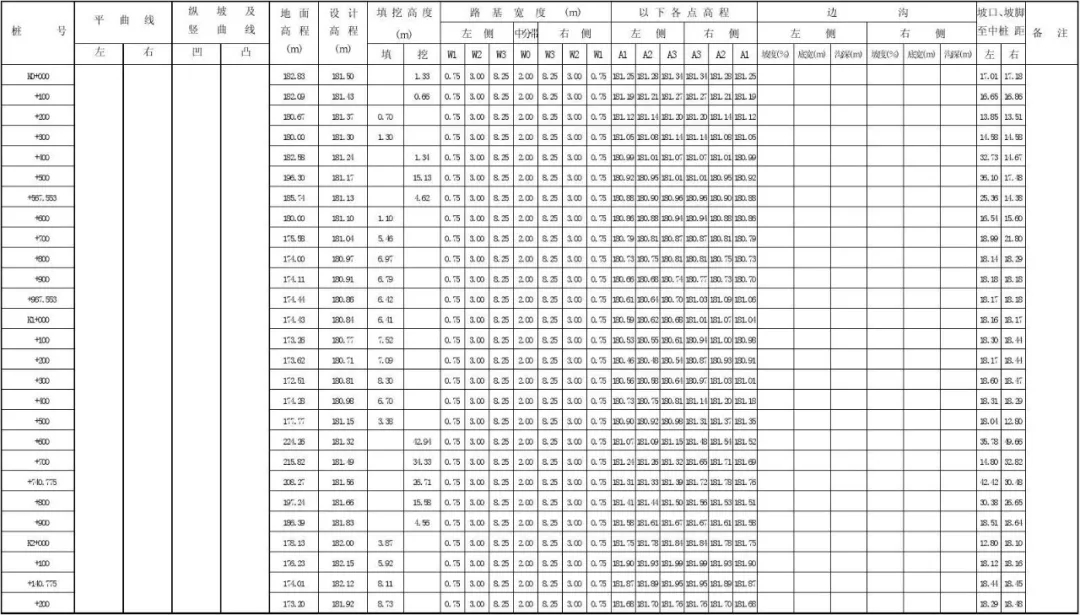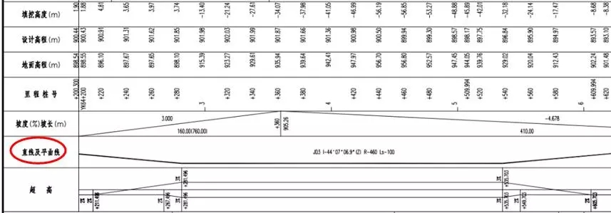 路基設計表:為便于施工,平曲線設計超高后,道路中線和內(nèi)、外側(路肩)邊緣線與設計高程之差應列于路基設計表中。計算時需要按照超高過渡段、全超高段分別計算中線、內(nèi)緣及外緣的高程。
