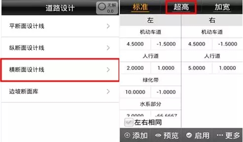 選擇對應超高作用的橫斷面板塊,此處以機動車道設超高為例輸入。