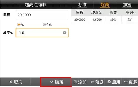 依次輸入四組超高點數(shù)據(jù),在預覽界面可以對應查看