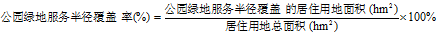 計算方法:公園綠地服務(wù)半徑覆蓋率=公園綠地服務(wù)半徑覆蓋的居住用地面積/居住用地總面積×100%