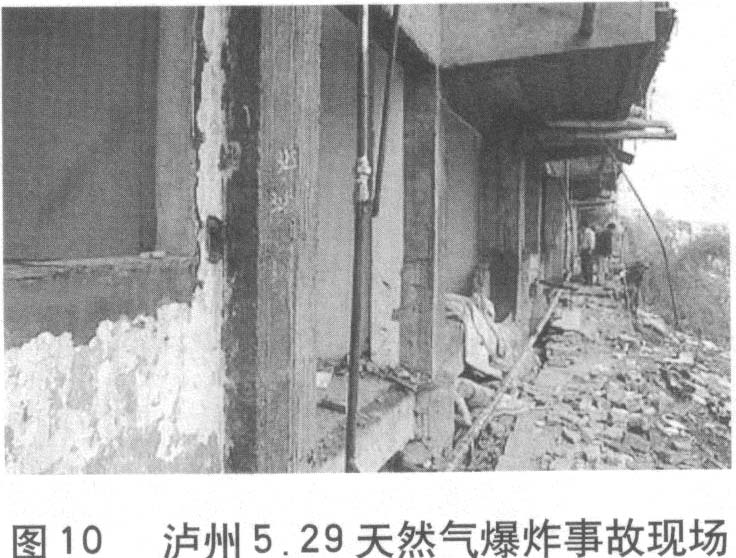 1.2006年8月30日上午,重慶市南岸區(qū)在進(jìn)行道路改造施工時(shí),挖掘機(jī)不慎將天然氣主管道挖破,導(dǎo)致天然氣猛烈外噴,氣柱高達(dá)近十米。事故發(fā)生后,上千戶(hù)居民被緊急疏散,未造成人員傷亡,當(dāng)?shù)鼐用竦娜粘I钍艿酵庥绊憽?br /> 2、2004年5月29日19時(shí)45分,瀘州市納溪區(qū)炳靈路15號(hào)居民樓人行道下,突然發(fā)生劇烈的天然氣爆炸事故,造成5人死亡,35人不同程度受傷,附近一樓10余居民的家園被毀,臨街一樓12間門(mén)面受損,近50米長(zhǎng)范圍內(nèi)的街道被震得一片狼藉。事故的原因是:管道局部的防腐層受到外力破壞,導(dǎo)致腐蝕穿孔,該位置正好位于民樓附一層與道路堡坎形成的窄縫中,地勢(shì)較低,聚集大量天然氣,因氣候變化因素發(fā)生膨脹而釋放至窄縫外,與空氣形成爆炸性氣體,遇人行道上不明火源而引發(fā)爆炸。