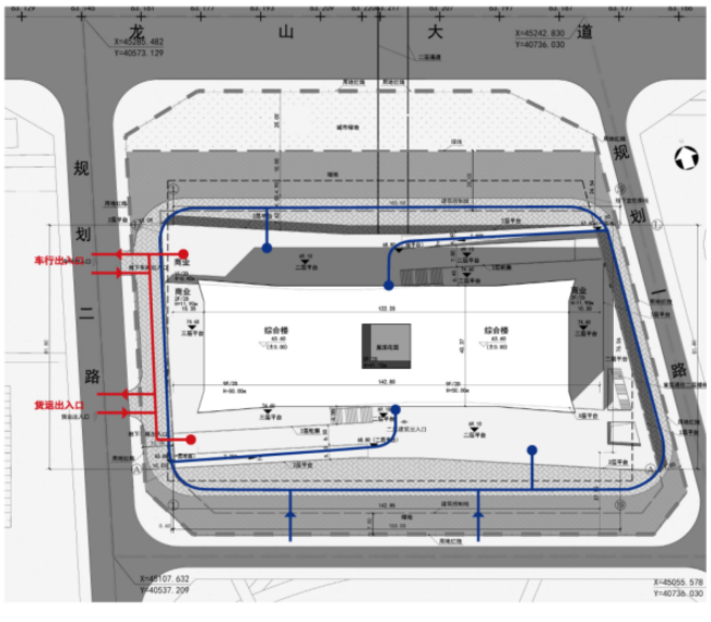 ②商業及三層辦公流線:由南北兩側主入口經過入口大廳進入首層,通過豎向交通,通往商業及三層辦公各層;也可以通過兩個室外坡道先上至二層平臺再通過二層入口大廳進入二層。