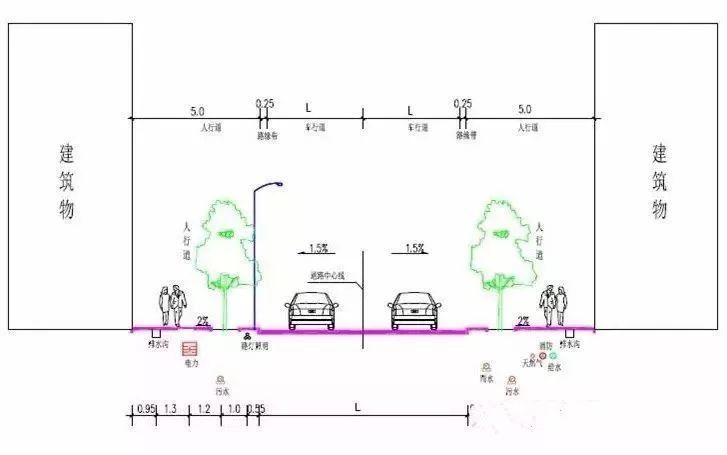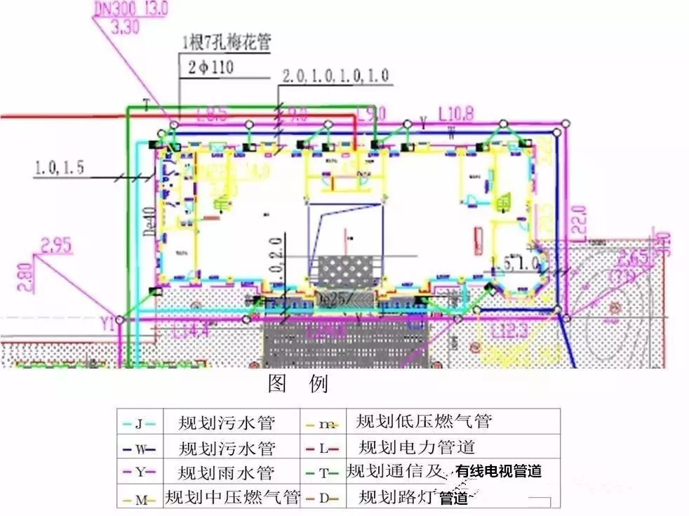 1、沒(méi)有具體平面尺寸,只有局部斷面圖,確定各個(gè)管道平行向的間距,但往往與景觀道路、綠化相矛盾;