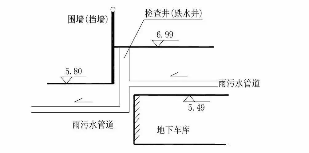 針對(duì)項(xiàng)目地下管線(xiàn)需跨越地庫(kù)、小區(qū)環(huán)路、市政道路3個(gè)標(biāo)高,小區(qū)雨污水管無(wú)法直接排入市政管網(wǎng),設(shè)計(jì)上選用跌水井,如圖。