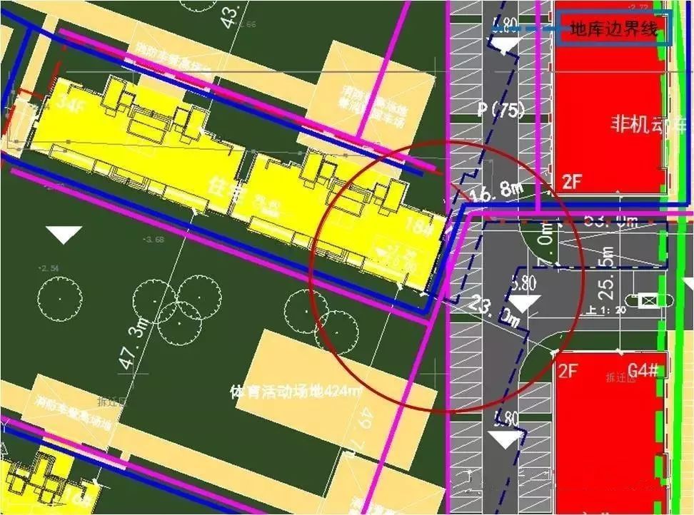 局部地庫(kù)邊界線(xiàn)給雨污水專(zhuān)業(yè)的跌水井讓出空擋,如圖。