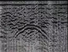 (4)管線深度和水平位置的確定:管線的深度可從雷達剖面圖上直接讀取,探地雷達系統自動把時間域轉換成空間域。電磁波在不同介質中的傳播速度是不一樣的,在確定管線深度之前,最好在測量區域內找一條已知管線進行傳播速度測試。管線的水平位置可由測量輪精確測得,而且探地雷達具有現場回拉定位功能,當屏幕上顯示出管線波形時(天線拖動方向與管線方向垂直時,典型波形反應為拋物線),可將天線回拉,屏幕上將出現一個光標,隨著天線的回拉,光標在雷達剖面圖上移動,當光標移動,當光標移到拋物線頂點時,天線的中心位置對應的就是該管線軸心的平面位置。