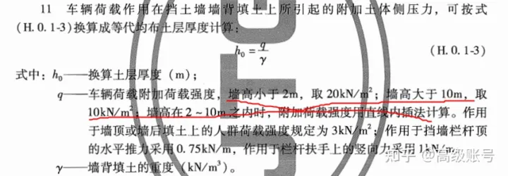 對(duì)于擋土墻的結(jié)構(gòu)設(shè)計(jì)和驗(yàn)算,在《公路路基設(shè)計(jì)規(guī)范》(JTG D30-2015)的附錄H里對(duì)行車荷載如何考慮是有規(guī)定的,H.0.1的11條,核心思路也是將車輛荷載換算為對(duì)應(yīng)土柱高度,但是相較穩(wěn)定計(jì)算則考慮的更為簡單,它的車輛荷載附加荷載強(qiáng)度值是給定的,10~20kPa,按照規(guī)定取就行了。