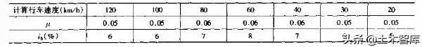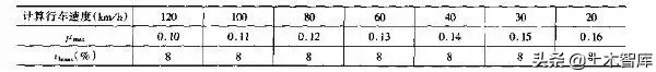 一般最小圓曲線(xiàn)半徑橫向力系數(shù)及超高橫坡度取用表