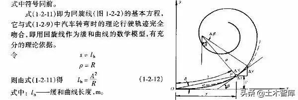 式(1-2-11)為汽車(chē)轉(zhuǎn)彎時(shí)的理論軌跡方程,從中可以得出兩個(gè)結(jié)論:—是該曲線(xiàn)上任一點(diǎn)的曲率半徑與該點(diǎn)至曲線(xiàn)起點(diǎn)距離成反比,它符合汽車(chē)在道路上的行駛軌跡;二是參數(shù)A對(duì)某一曲線(xiàn)來(lái)說(shuō),是一個(gè)常救,但就整個(gè)公路線(xiàn)形而言,其實(shí)質(zhì)為一個(gè)放大倍數(shù),它適應(yīng)于不同的情況,因此,需建立一個(gè)數(shù)學(xué)模型來(lái)作為緩和曲線(xiàn)。