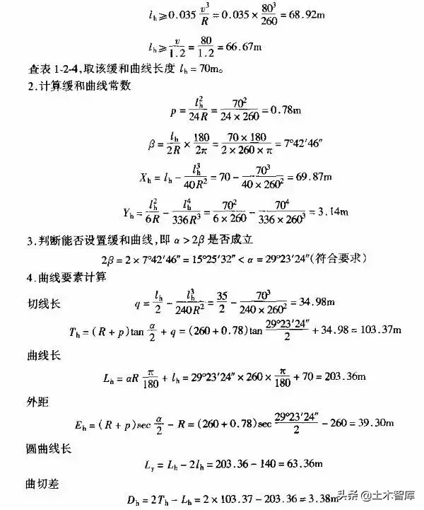例1-2-4 某平原微丘區(qū)二級(jí)公路有一彎道,其平曲線(xiàn)半徑及R=260m,交點(diǎn)JD校號(hào)