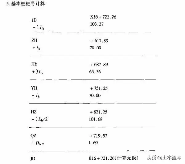 1)在JD處沿兩切線(xiàn)方向分別量取103.37m得平曲線(xiàn)起點(diǎn)(ZH)終點(diǎn)(HZ)的位置;