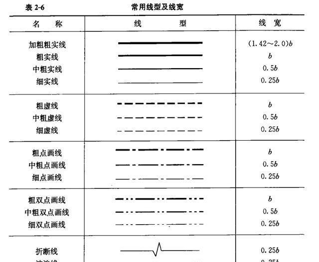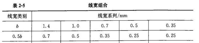 2)每張圖上的圖線線寬不宜超過3種。基本線寬((b)應根據圖樣比例和復雜程度確定。線寬組合宜符合表2-5的規定.
