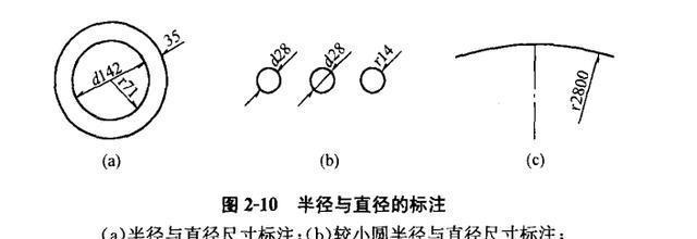 (8)半徑與直徑可按圖2-10(a)標注。當圓的直徑較小時,半徑與直徑可按圖2-10(b)標注;當圓的直徑較大時,半徑尺寸的起點可不從圓心開始,見圖2-10(c)0半徑和直徑的尺寸數字前,應標注“r(R)”或“d(D)",見圖2-10(b).