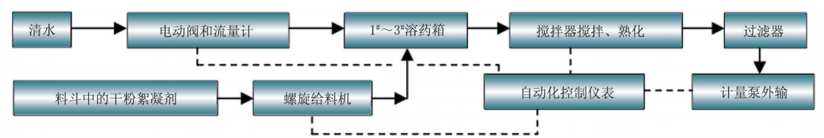 在污水處理系統(tǒng)中,為了除去或降低水中懸浮物,使其產(chǎn)生大顆粒的凝聚體,加快水中雜質和污泥沉降速度,一般在污水處理的沉降部分加入一定濃度的絮凝劑。用于含油污水處理的絮凝劑包括無機絮凝劑、有機絮凝劑和復合絮凝劑 3 大類。為了保證加藥濃度、減輕工人勞動強度和降低藥劑成本,應用絮凝劑自動加藥工藝技術。