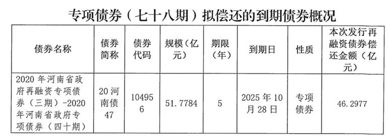 2025年河南省政府專項債券(七十八期)擬發行金額46.2977億元,用于償還2020年河南省政府再融資專項債券(三期)-2020年河南省政府專項債券(四十期)的部分本金。