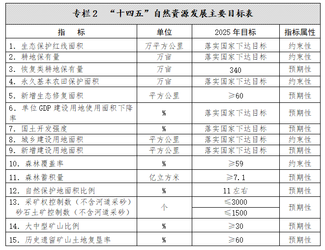 ——以耕地保護為核心的自然資源保護體系更加完備。“耕地占補平衡”全面落實,山水林田湖草沙系統修復力度不斷加強,生產礦山全部達到綠色礦山標準,耕地保有量和永久基本農田保護面積不低于國家下達目標,生態保護紅線面積不少于4.21萬平方公里,森林覆蓋率不低于59%,森林蓄積量不少于7.1億立方米,自然保護地面積比例穩定在11%左右。