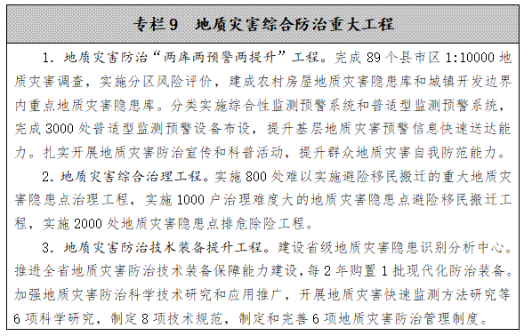 健全完善地質災害防治技術標準和制度體系。編制地質災害調查評價、監測預警、工程治理、風險管控等技術要求和標準規范,形成符合我省實際的地質災害防治標準體系。健全地質災害危險性評估、農民建房地質災害風險簡易評估等相關制度,形成完善的地質災害防治制度體系。